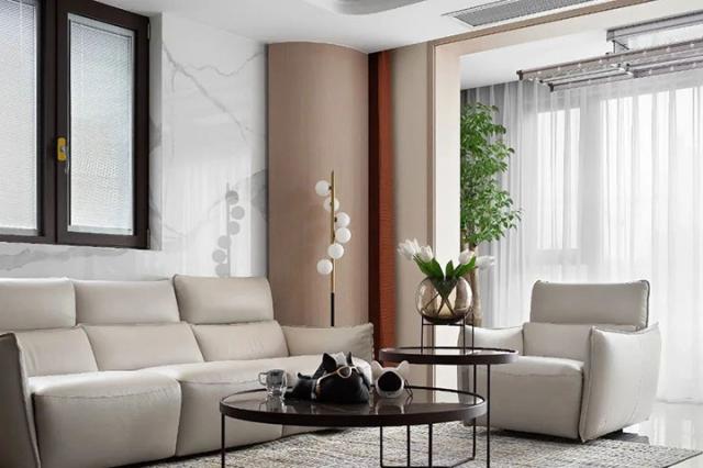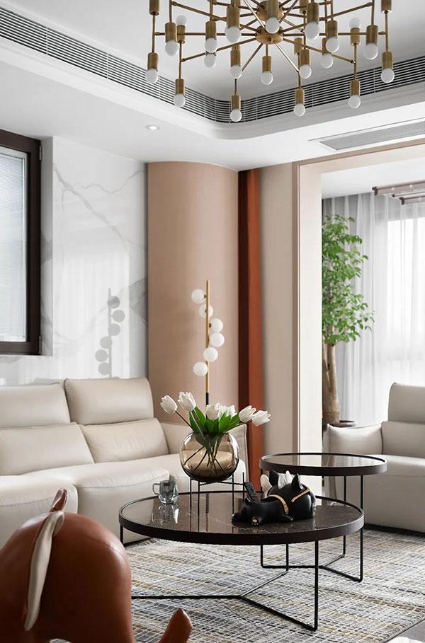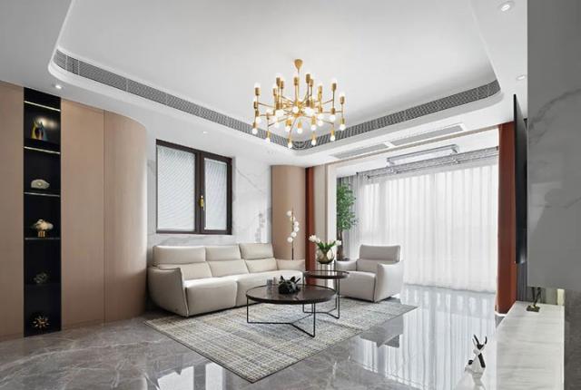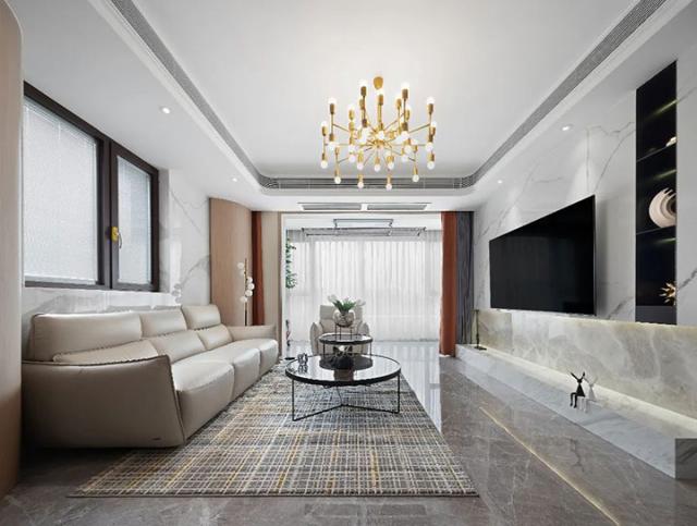 客厅以灰色为主题色调,金色艺术吊灯在客厅中心尤为亮眼,成为中心区主要点缀,与以往格局有别的是沙发靠墙处多了一扇大面积窗户,与户外形成良好贯穿,为通风和观景提供了良好的条件。