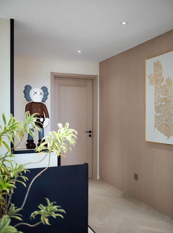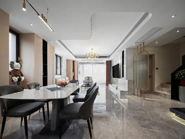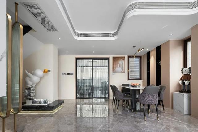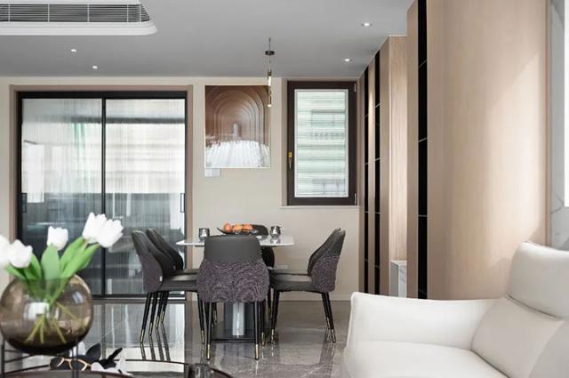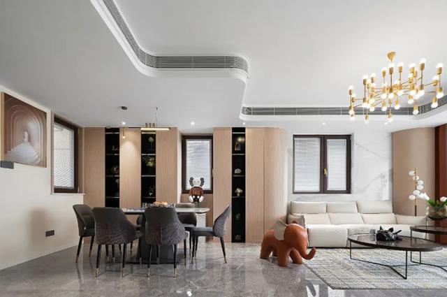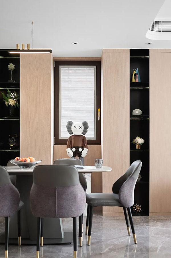 将客厅、餐厅、厨房相连,让空间尺度更加宽阔,餐边柜根据房屋格局设计,利用边角空间完成收纳功能搭建,圆弧流线形柜体对工艺有一定要求,随处摆放的艺术装置,让精致淡雅的空间多了几分有趣。