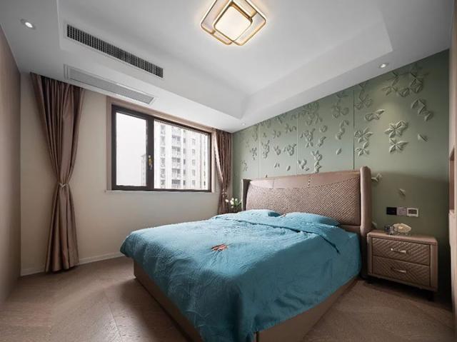 老人房庄重典雅,色彩上更加沉稳大气,背景墙采用绿色雕花材质,为空间增加生机,寓意喜乐、安康。