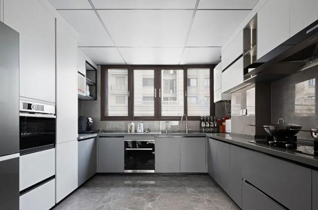 厨房宽敞明亮,现代化多功能一体橱柜满足烹饪所需,线条的勾勒让充满烟火气的空间变得井井有序。