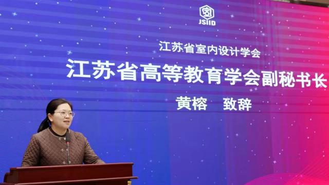江苏省高等教育学会副秘书长黄榕在致辞中对学会在学术交流、人才培养等方面取得的成果表示肯定。她指出,室内设计学科兼具艺术性与科学性,是高等教育服务社会、对接产业的重要载体。她希望学会继续发挥桥梁纽带作用,推动设计教育与行业实践深度融合,为培养更多高素质应用型设计人才贡献力量。