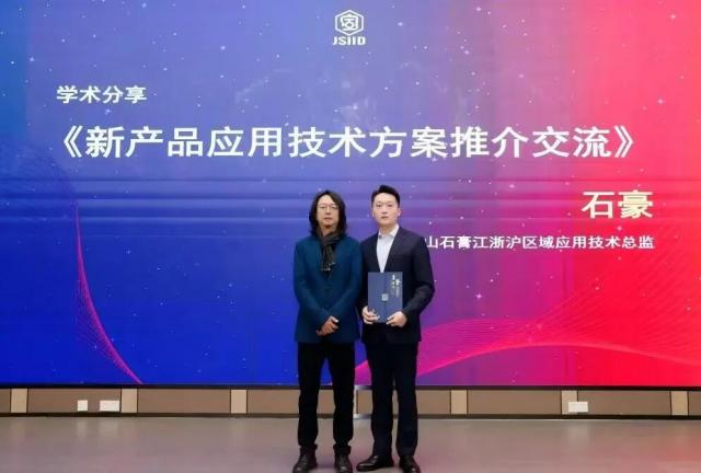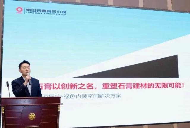 泰山石膏江浙沪区域应用技术总监石豪作为企业代表,围绕《新产品应用技术方案推介交流》进行了专题分享,他重点介绍了泰山石膏2026年初最新投产的GF石膏基植物纤维板,该产品历经六年技术攻关,实现A1级防火、ENF级无醛环保标准,且成本较木质板材降低30%。目前,该产品首条年产2000万平方米生产线已进入试产阶段,将为室内设计行业提供更加绿色、安全、高性价比的基层板材解决方案。