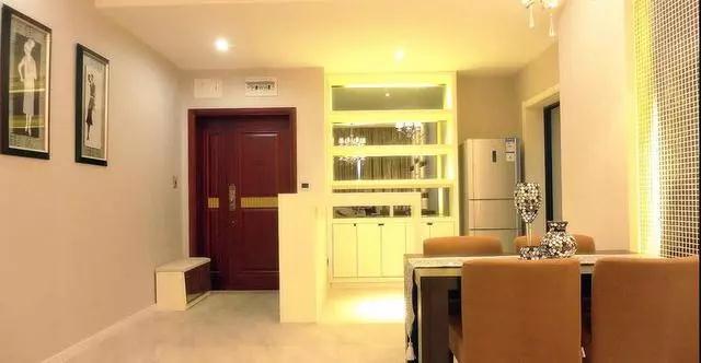 客厅角度拍摄的入户,没有做整面的柜子,而是设计的低矮鞋柜,更加的通透,而与客厅之间也是采用的雕花面板作为隔断,主要还是考虑的风水问题;
