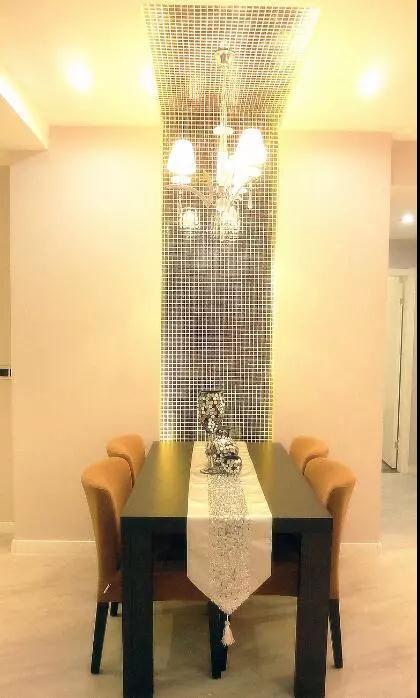 餐厅,最吸引眼球的是背景墙的马赛克处理,一直从墙面延伸到顶部,整体效果非常不错,以沙发背景墙相呼应;