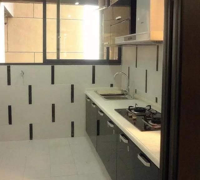 厨房,面积不大,装修也比较简单,为了增加室内的采光和通风,在墙面设计的一整扇窗户,让空间不至于太压抑,黑白色为主色调的橱柜搭配,也是经典大气;