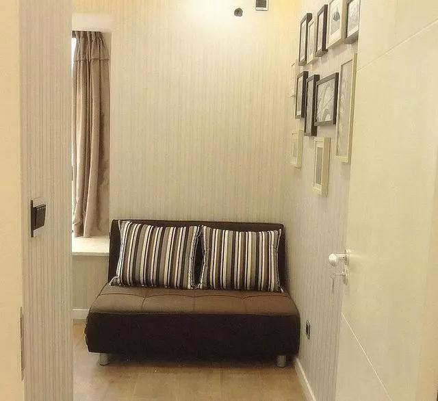 儿童房,进门就是摆放的沙发床,墙面采用的竖条纹壁纸作为装饰,为了避免空间的过于单调,墙面设计的照片墙,简约时尚;