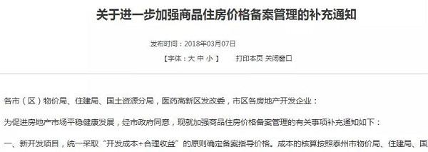 已进行过价格备案的开发项目,维持备案价格不变。同一小区分批次开发的项目,仍按泰州市住建局、物价局、国土资源局《关于进一步促进市区房地产市场平稳健康发展的通知》(泰建发〔2017〕214号)执行。