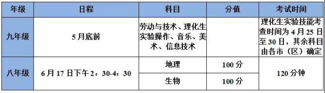 生物、地理由市教育局组织命题,考试方式为闭卷考试,统一安排在八年级进行;音乐、美术、信息技术、劳动与技术和理化生实验等均按课标基本要求,由各市(区)组织命题, 统一安排在九年级进行,分学期由各市(区)教育行政部门统一组织,各初中学校负责测试。